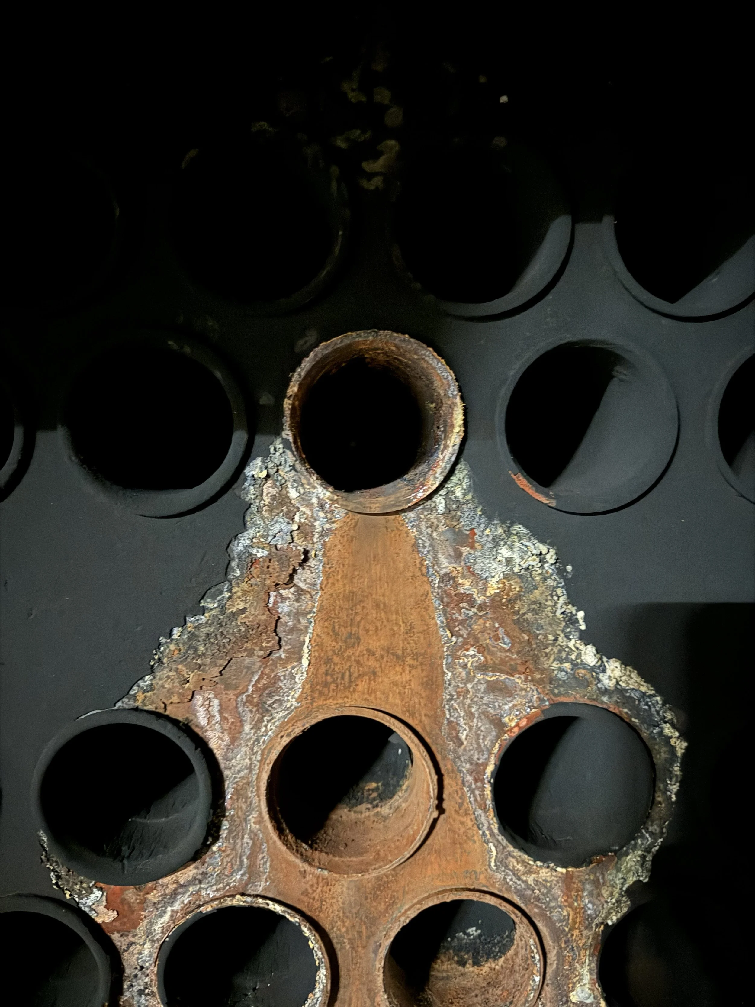 Corrosion and pitting on boiler shell, tubes, or headers — caused by dissolved oxygen and low pH in untreated feedwater